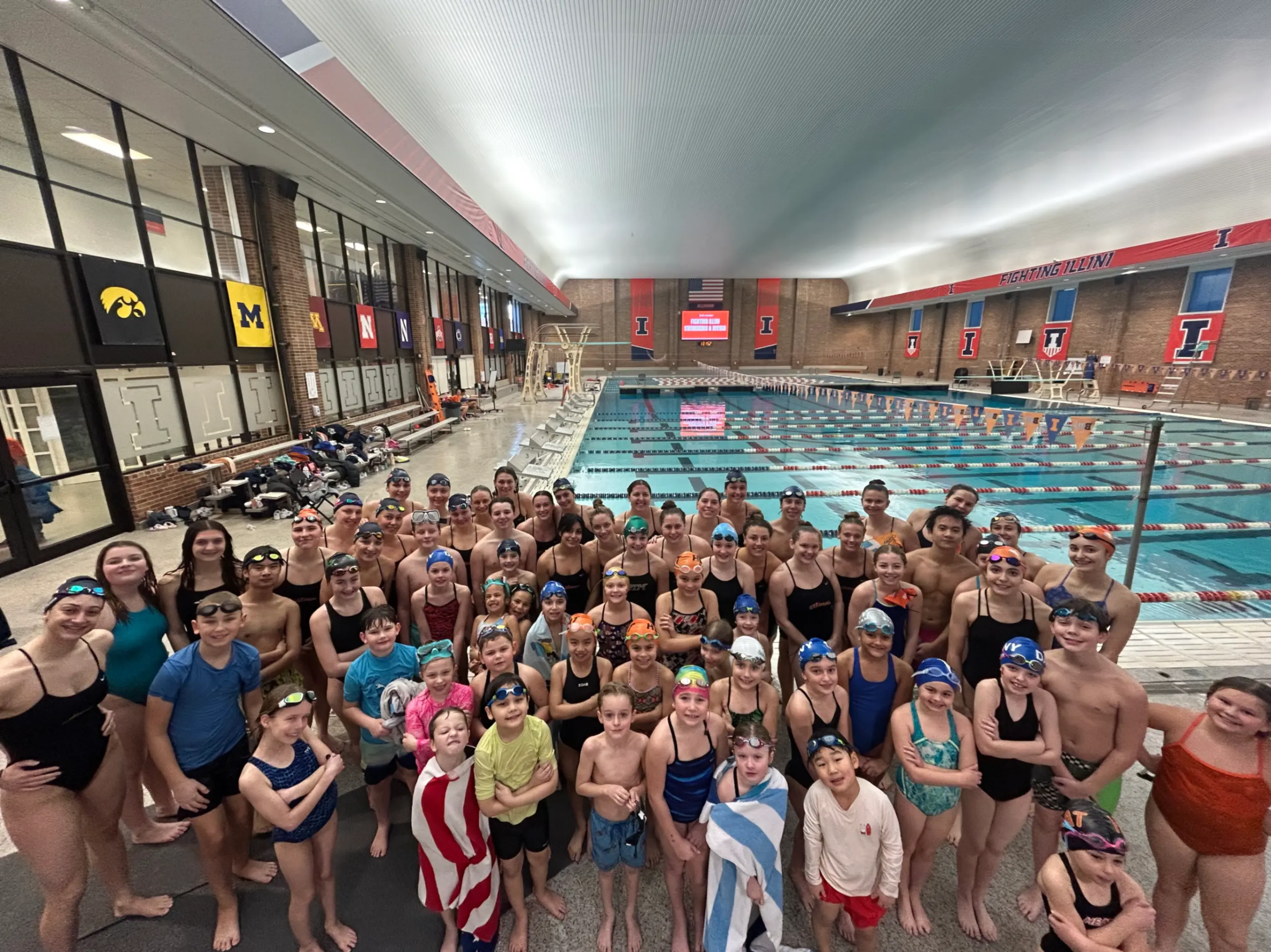 The ARC Pool was buzzing with energy Saturday morning as more than 100 swimmers, families, and fans packed the stands for an unforgettable Illini Swimming experience that blended live Big Ten competition with hands-on coaching from the entire Illinois Swimming Team. Following the Illini’s dual meet against Iowa and Nebraska, the Illinois program hosted a free youth swimming clinic designed to bring young swimmers closer to the sport by combining high-level competition with direct instruction from Division I athletes all in one action-packed morning.